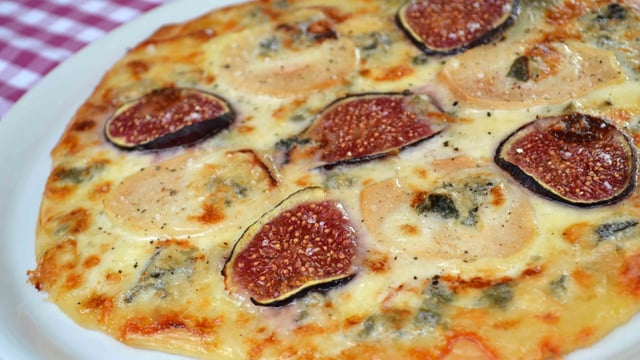 Si vous aimez le sucré-salé, voilà une pizza qui devrait vous plaire !En plus c'est très rapide à préparer, il faudra juste patienter quelques minutes avant de la déguster ;-)