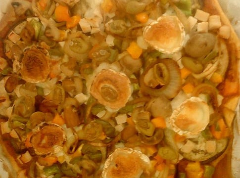 - 7Par-dessus ajoutez des dés de poulet, puis les oignons coupés et les champignons. Parsemez de poivrons coupés en cubes et d'olives. Déposez, par-dessus le tout, les rondelles de bûche de chèvre.