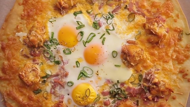 Parsemer d'oignon nouveau ciselé et casser les oeufs sur la pizza. Poivrer.