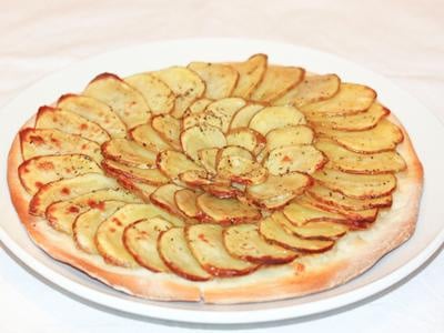 Une pizza originale avec une pâte croustillante parfumée à l'ail recouverte de fines tranches de pommes de terre et romarin...