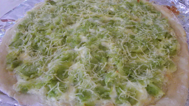 Mettez les ingrédients de la pâte dans un jatte. Mélangez et pétrissez 5 à 7 minutes. Laissez reposer pendant 1 heure. Une fois que la pâte a doublé de volume, étalez la pâte sur une surface plane à l'aide d'un rouleau à pâtisserie.
