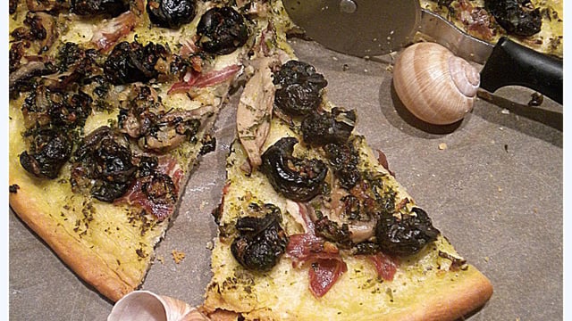 Préparer la pâte à pizza. L'étaler sur un papier cuisson et la poser sur une plaque allant au four. Étaler le pesto, couper des lamelles de coppa, puis, déposer les ingrédients réservés (champignons + escargots + beurre).