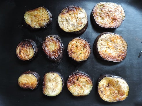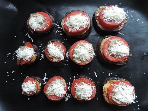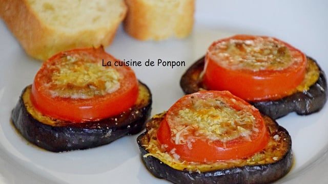 3Saupoudrez de parmesan râpé. Enfourner les pizzas d'aubergine sous le grill jusqu'à ce que le fromage soit doré. Servir aussitôt avec une salade verte (rouge pour moi avec des tomates) ou pas et une baguette.