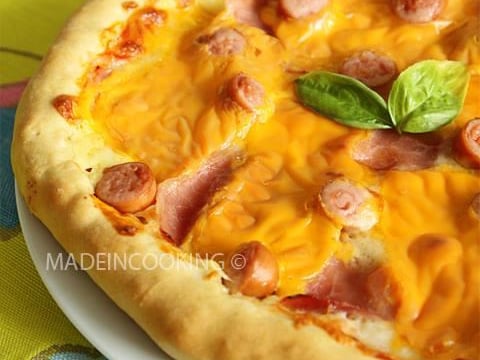 Parsemer un peu de mozzarella selon l'envie par dessus le ketchup-moutarde. Puis recouvrir de jambon et de morceaux de cheddar coupés. Disposer un peu partout des rondelles de saucisse. Enfourner pendant 15-20 minutes. Surveiller la cuisson, il faut que la croûte soit dorée.