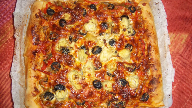 Ajoutez les olives et quelques coeurs d'artichauts coupés en deux. Couvrez le tout d'emmental et de mozzarella.