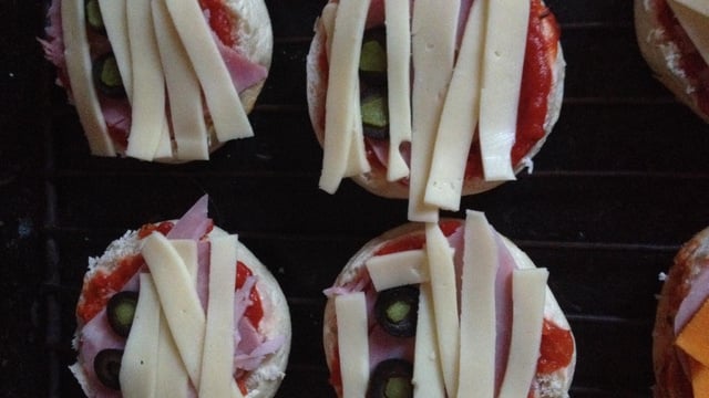 Coupez les muffins en deux, étalez la sauce pizza sur chaque face, déposez des morceaux de jambon , disposez une tranche d'olive noire pour les yeux et un tout petit bout de cornichon pour la pupille dans le trou de l'olive. Déposez des fines tranches de fromage pour faire les bandelettes.