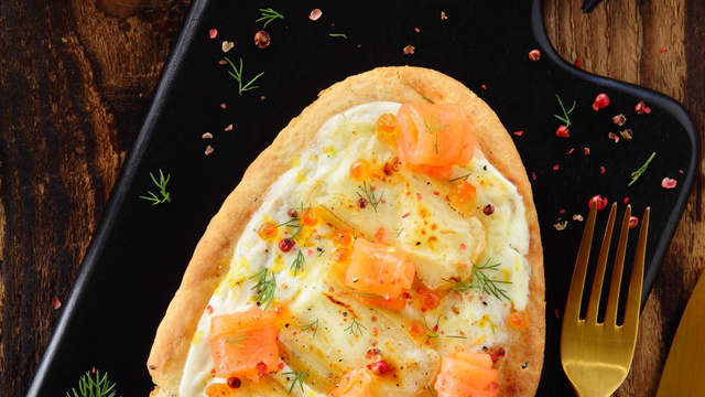 Moitié pizza, moitié naan, cette recette pour le moins originale scelle la rencontre entre deux pays réputés dans le monde entier pour leur gastronomie. Le mariage de ces deux plats incontournables joue ainsi la carte du peps et de la bonne humeur. Sur un délicieux naan, la garniture associe une base de crème fraîche délicatement citronnée, de fines lamelles de saumon fumé et des tranches de Chevrotin AOP avec ses arômes riches en caractère. Pour la touche finale, quelques baies roses et œufs de saumon, le tout parsemé d’aneth frais ciselé.