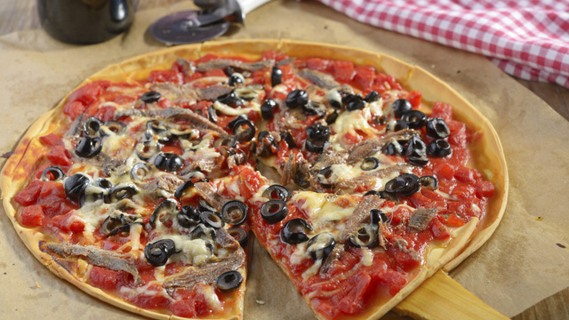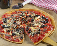 Etaler la pâte dans plat à pizza, ou sur une plaque recouverte de papier sulfurisé. Ajouter la sauce et disposer les filets d'anchois. Couper en rondelles les olives et les ajouter.