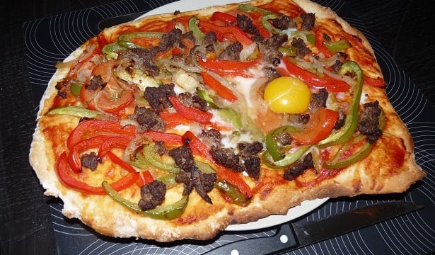 - 4Couper les poivrons en lamelles.Les éparpiller sur la pâte.Éparpiller également des morceaux de steak haché avec les oignons.