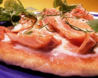 Détailler la mozzarella en lamelles et la disposer sur les ronds de pâte frits et garnir de saumon. Ciseler un peu de ciboulette et agrémenter de basilic, saler et poivrer. Servir aussitôt.