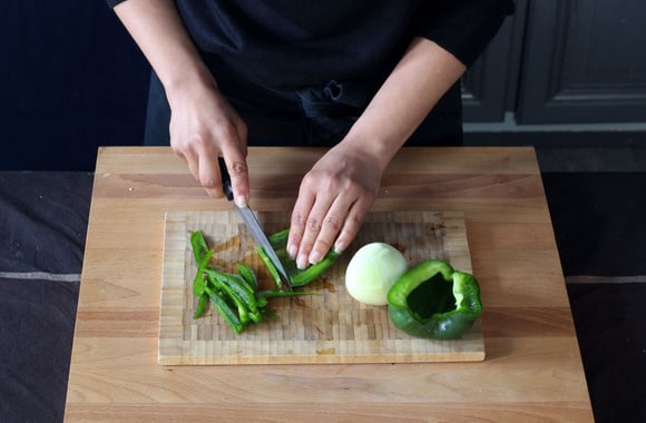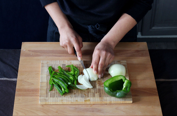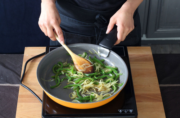 3Dans une poêle, faites revenir l'oignon et les poivrons dans l'huile d'olive, salez et poivrez puis faites cuire pendant 10 minutes.