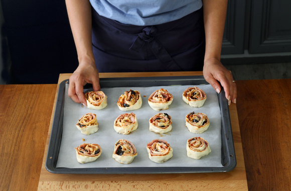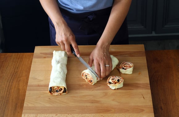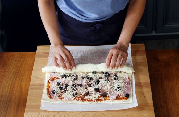 8Enroulez la pâte à pizza sur elle-même en serrant bien, afin d'obtenir un gros boudin.