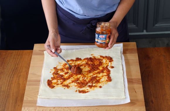 4Étalez la pâte à pizza sur le plan de travail, badigeonnez-la avec le pot entier de pesto rustico, poivrez.