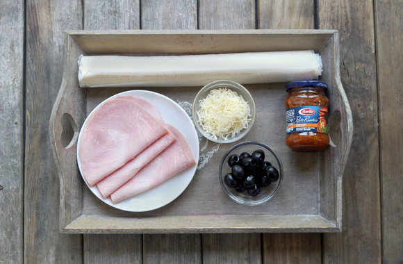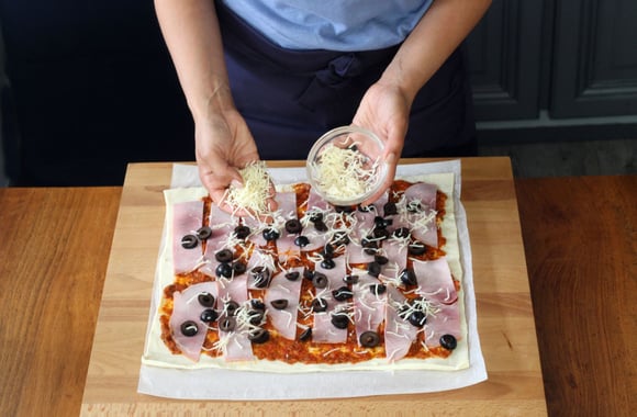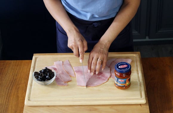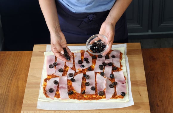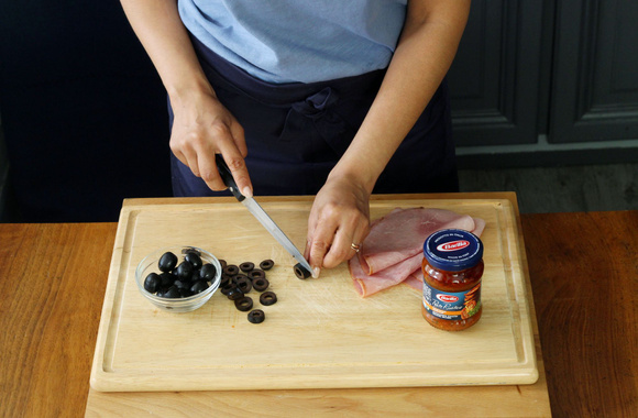 2Préchauffez-le four à 200°C. Coupez les olives noires en rondelles.