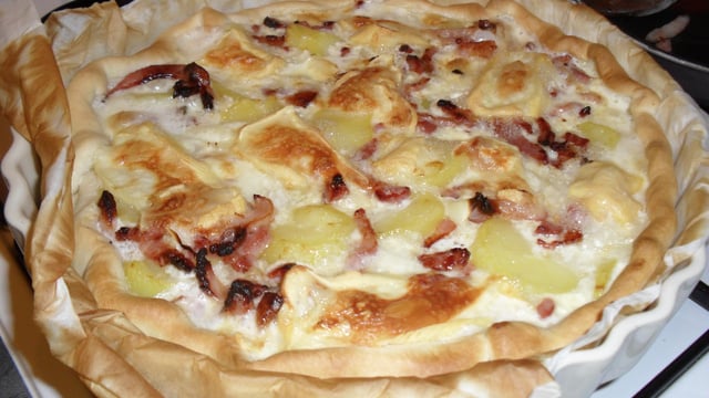 Rajoutez les pommes de terre, les oignons, les lardons et les tranches de fromage. - 5