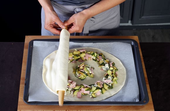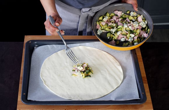 6Mettez 3 cuillères à soupe de garniture au milieu de la pâte.