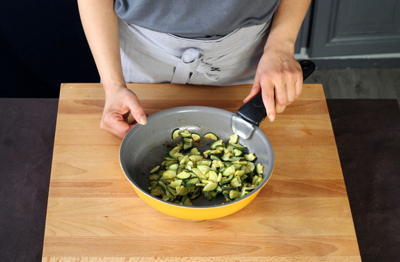 1Coupez les courgettes en petits dés puis faites-les revenir dans une poêle avec l'huile d'olive jusqu'à ce qu'elles soient tendres. Salez très légèrement et poivrez.