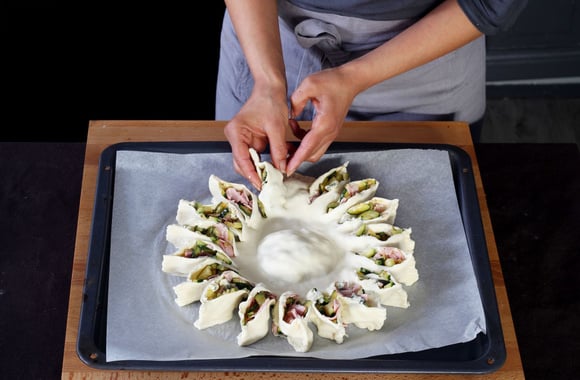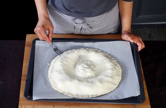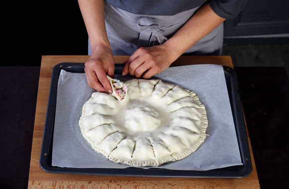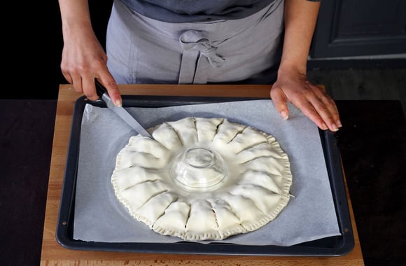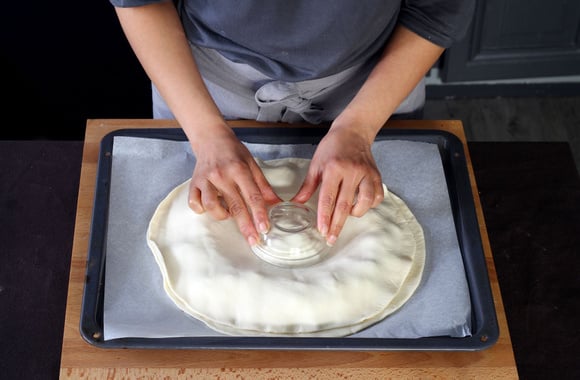 9Déposez un petit bol ou ramequin sur la farce du milieu afin de faire une empreinte et de souder la pâte.