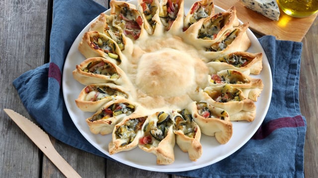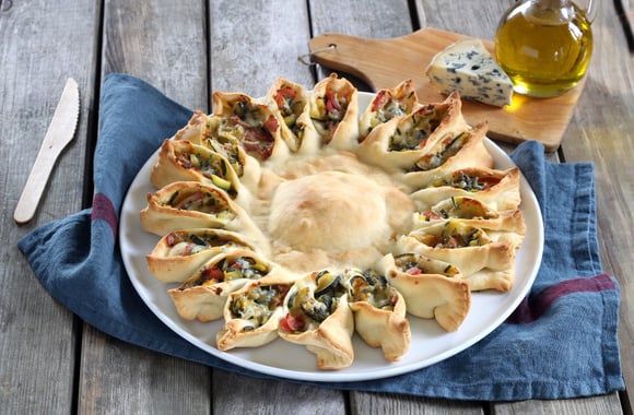 Une jolie pizza soleil à la Fourme d'Ambert, originale et gourmande.