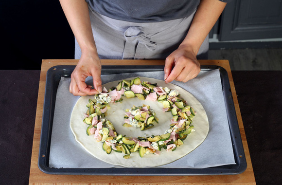 12Avec un couteau tranchant, découpez des bandes de 3 cm tout autour de la pizza garnie en commençant à 1 cm de l'emplacement du bol ou du ramequin.