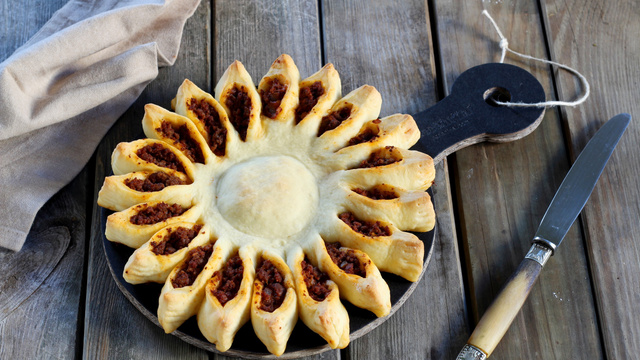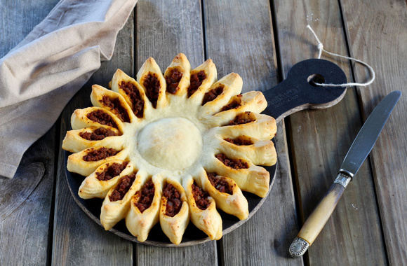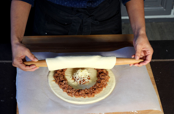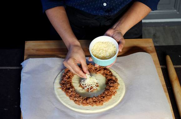 Déposez 4 cuillères à soupe de bolognaise au milieu de la pâte puis tout autour en formant une couronne avec le reste de la garniture.