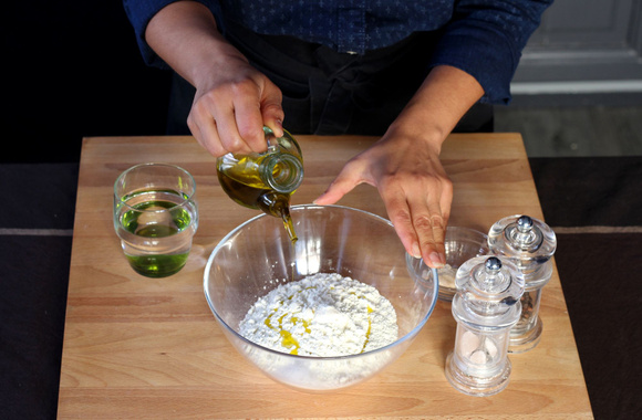 Dans un saladier, versez la farine et ajoutez l'huile d'olive.