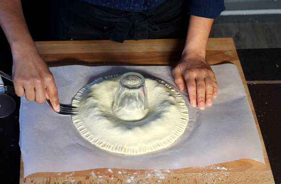 11Déposez un petit bol ou ramequin sur la farce du milieu afin de faire une empreinte et une soudure.