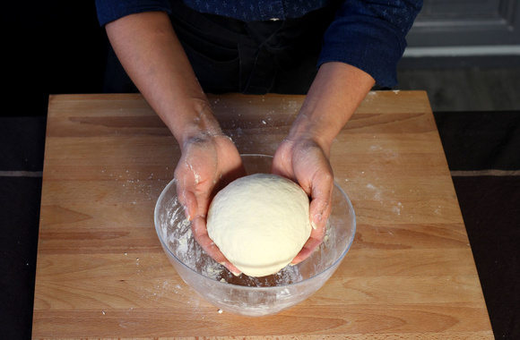 Dégazez la pâte à pizza sur un plan de travail fariné puis divisez-la en 2 parts égales. Façonnez des boules.