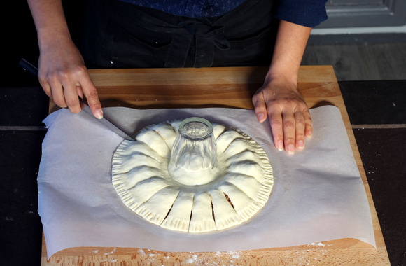Avec un couteau tranchant, découpez des bandes de 3 cm tout autour de la pizza garnie en commençant à 1 cm de l'emplacement du bol ou ramequin du milieu (voir photos).