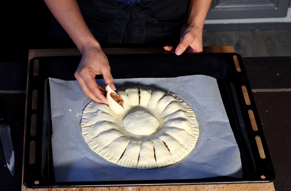 Retournez chaque bande de pâte découpée afin que la farce soit visible. Enlevez le bol ou le ramequin du milieu puis piquez à la fourchette l'empreinte laissée par le bol ou le ramequin.