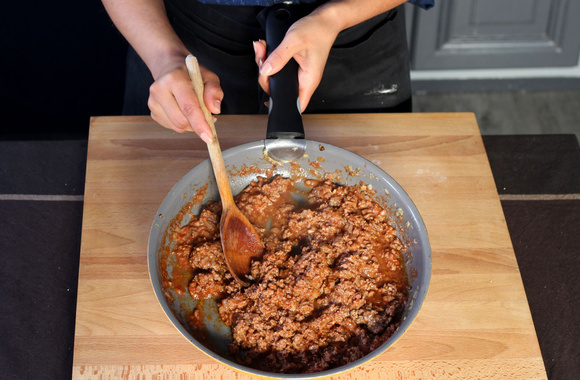 Dans une poêle, faites revenir l'ail et l'oignon dans l'huile d'olive. Ajoutez progressivement la viande hachée en l'écrasant avec une fourchette. Salez et poivrez.