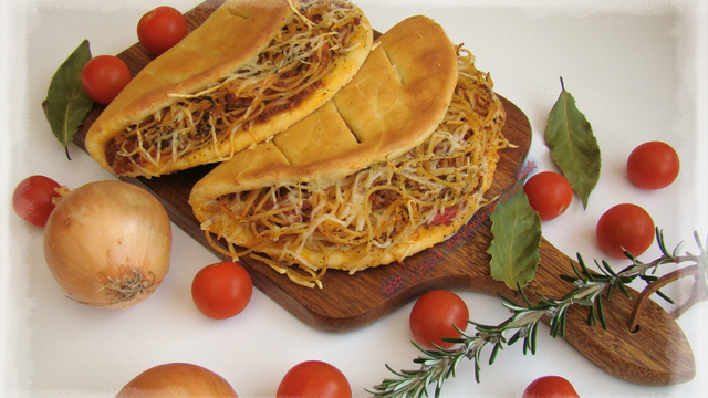 Abaissez la pâte à l'aide d'un rouleau sur un plan de travail fariné. Formez des cercles à l'aide d'une assiette à dessert. Pliez au 3/4,le cercle. Sur les 3/4 du cercle,déposez de la sauce bolognaise,du fromage râpé,du parmesan,et des spaghetti bolognaise. Rajoutez du fromage râpé et du parmesan. Pliez le quart de la pâte sur la préparation. Incisez le dessus de la pâte. Badigeonnez d'huile d'olive.