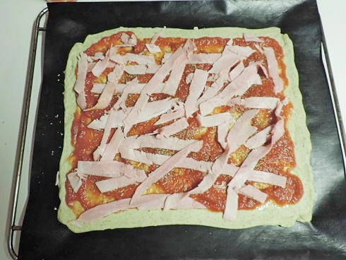 1Etaler la pâte à pizza sur un papier sulfurisé. La recouvrir de coulis de tomate jusqu'à 1cm des bords. Parsemer de fleur de sel et d'herbes de Provence. Garnir de jambon blanc émincé et de tranches de fromage.
