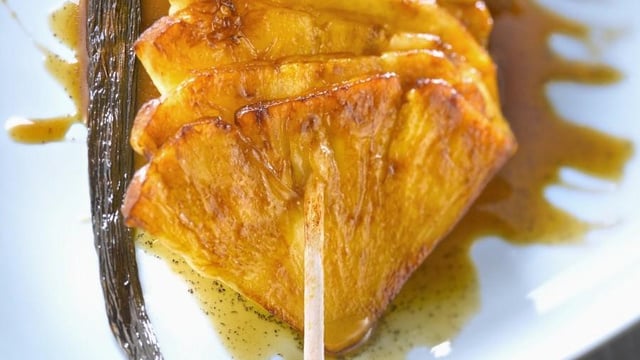 Retirez les ananas. Ajoutez 5 cuillères à soupe de sirop dans la poêle et laissez réduire. Incorporez le reste du beurre en remuant.