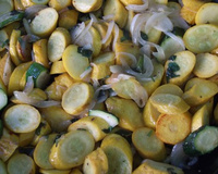 - - Eplucher et tailler en fines lamelles l'oignon et le faire revenir dans une poêle à l'huile d'olive.- Laver et découper en lamelles les courgettes.- Ajouter les courgettes à l'oignon.- Cuire pendant une dizaine de minute et assaisonner.- En fin de cuisson, ajouter la menthe coupée en lamelles et servir aussitôt !