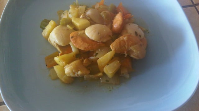 Poêlée de saint Jacques aux oignons, pommes poivrons et épices.