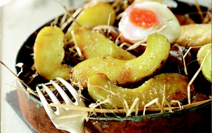 A table, écraser les Ratte du Touquet dans l'assiette et casser les oeufs par dessus.