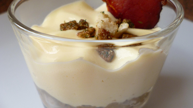 Versez la préparation dans la cuve d'un siphon, percutez une cartouche de gaz ; secouez et réservez au frais jusqu'au moment du dressage.