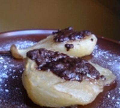 - Eplucher la poire, la faire pocher pendant 15 minutes dans de l'eau sucré (ajouter du mélange 4 épices dans l'eau).Couper la poire en deux. Mélanger le beurre ramolli, le Nesquik et la farine. Vider le centre de la poire et y ajouter le mélange au chocolat.Faire griller 5 minutes au four. Déguster bien chaud.