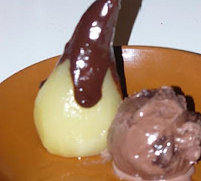 Dresser les poires dans une assiette creuse, ajouter 2 boules de glace puis verser le chocolat chaud sur les poires.