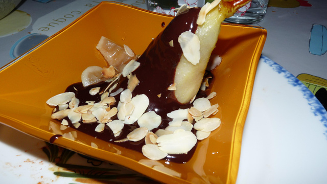 Placez les dans des assiettes. Faire fondre 150-170 gr de chocolat en morceaux au bain-marie avec une cuillère à soupe d'eau. Une fois le chocolat fondu, verser sur les poires.