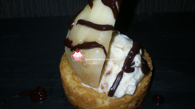 Une poire belle hélène posée sur un croustillant de spéculoos.