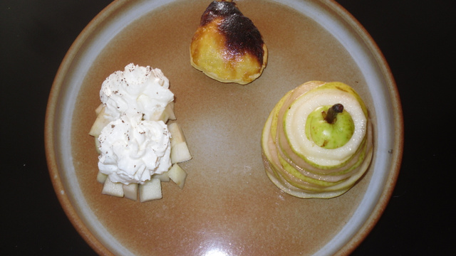 Poire cuite/crue reconstituée à la confiture de coing, brunoise de poire chantilly vanille et feuilleté en forme de poire