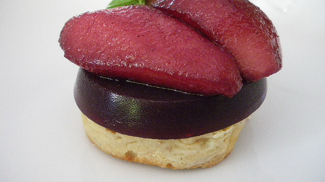 Ce dessert se compose de poires cuitent au vin, de gelée de vin aux épices, et d'un moelleux aux poires, ce moelleux aux poire peut être remplacé par de la brioche cuite comme du pain perdu.