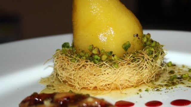 Une poire pochée au safran et aux épices dans un jus de pommes sur un nid de kadaïf (cheveux d'ange) le tout parsemé de pistaches, un dessert qui allie l'occident à l'orient. Un dessert subtilement bon et raffiné à servir avec un coulis de framboises.