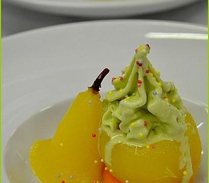 Épluchez les poires et pochez-les dans le reste du sirop pendant une quinzaine de minutes. Égouttez les poires. Refroidissez les poires et creusez-les. Garnissez les poires de glace pistache. Décorez avec quelques billes colorées. Arrosez de chocolat au moment de servir les poires.