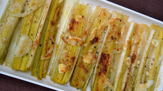 Disposez les poireaux dans un plat à gratin, faites réduire un peu le jus de cuisson et versez-en un peu sur les poireaux.