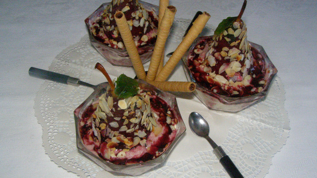 Dés que la gelée est complètement délayée, retirer la casserole du feu. Laisser refroidir la sauce, puis en napper les poires et les parsemer d'amandes grillées