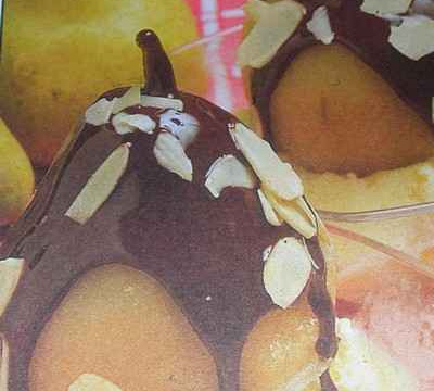 Eplucher les poires faire fondre les deux chocolat avec une gouse de vanille et zezt d,orange puis verser sur les poires finir par des amandes grillees ilne reste plus qu'a deguster