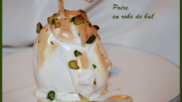 A l'aide d'une spatule, masquer les poires avec la meringue en laissant dépasser la queue. Les parsemer des pistaches grossièrement concassées. Les disposer debout dans un plat légèrement beurré. Enfourner pendant 5 à 10 minutes. Surveiller la cuisson de la meringue.